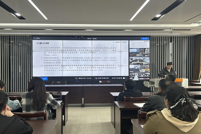 陈建作了题为“同群效应对中国农村家庭能源贫困的影响”的学术报告,探讨了同群效应是否以及如何影响中国家庭能源贫困。研究表明,家庭能源贫困显著受到同村其他家庭能源贫困程度的影响,即存在显著的同群效应。陈建从论文选题、文献综述、研究过程、方法选择等多方面进行了详细讲解,与会教师们对陈建的论文进行了点评,在交流中,教师们各抒己见,提出了诸多宝贵的修改建议,为论文的进一步完善提供了新的思路。