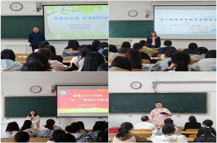 为进一步加强学生安全教育管理工作,强化学生安全意识,4月29日,财经学院各班分别召开“五一”假期安全主题班会。会上,各位辅导员从交通安全、食品安全、消防安全、网络安全、防溺水安全等方面,结合案例展开针对性讲解,提醒学生离开宿舍,务必要切断所有电源、锁好门窗、清理废旧物品,做好防火防盗工作;出门在外,不搭乘存在安全隐患的交通工具,注意人身和随身财物安全;假期在家,注意用电安全,远离危险水域。