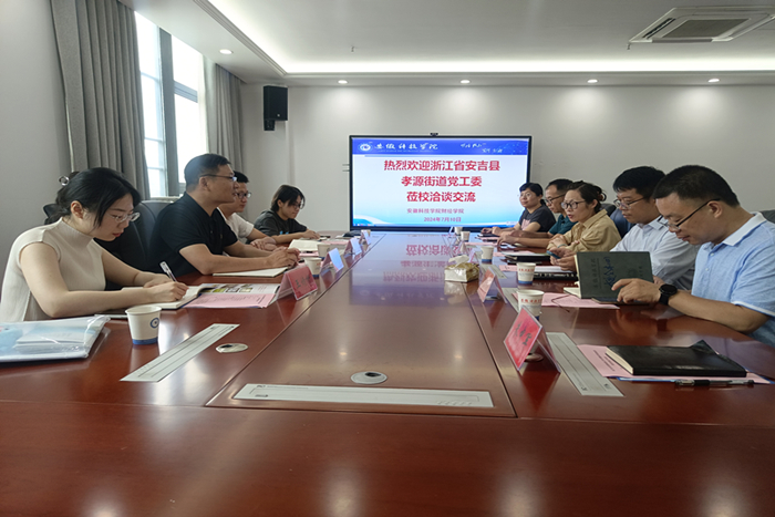 7月10日,浙江省安吉县孝源街道党工委书记沈高飞一行来校洽谈校地合作。学院党政领导、就业联系人参加会议。会议由学院党委副书记、纪委书记耿广汉主持。