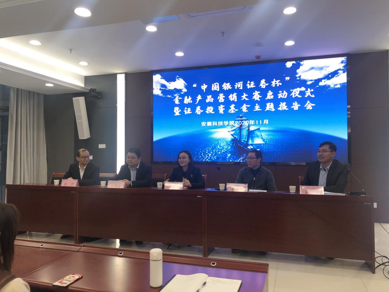 11月11日下午,财经学院在龙湖校区西辅楼111会议室举办“中国银河证券杯”金融产品营销大赛启动仪式暨证券投资基金主题报告会。财经学院副院长金怀玉、中国银河证券蚌埠营业部经理周瑛钰、理财部经理王四力、营销部部门经理周宇出席。本次会议由金融工程系主任王勇主持。