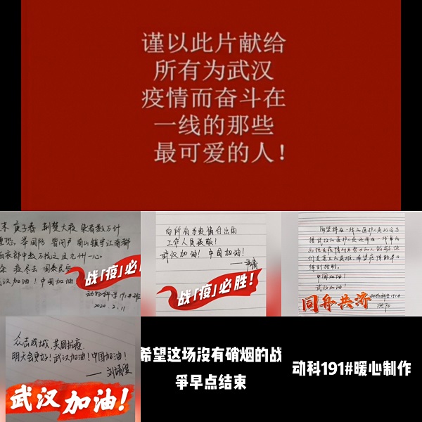 “中国加油,武汉加油”“没有一个冬天不可逾越,没有一个春天不会来临……”动物科学191班团支部采用了手写祝福的方式来对正在进行抗“疫”一线的工作人员以及武汉送去一份关爱。一句句祝福的话语,传达出团员青年们对抗击疫情的必胜信心。