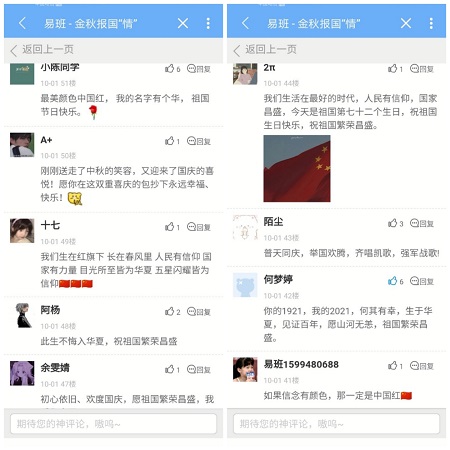 十月,为激发当代大学生的爱国热情、弘扬报国之志,为我国周年华诞增光添彩,展现新一代青年的风貌,动物科学学院易班工作站以轻应用的形式开展“金秋报国情”主题活动。