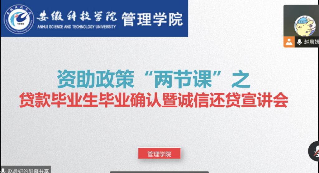 为有效落实资助政策“两节课”制度,进一步做好学生资助政策宣传工作,顺利开展2023届贷款毕业生毕业确认和还款工作,增强贷款毕业生的诚信还贷意识,5月23日晚,管理学院通过腾讯会议线上召开资助政策“两节课”之贷款毕业生毕业确认暨诚信还贷宣讲会。会议由学院资助工作联系人赵晨妍主持,2023届贷款毕业生参加会议。