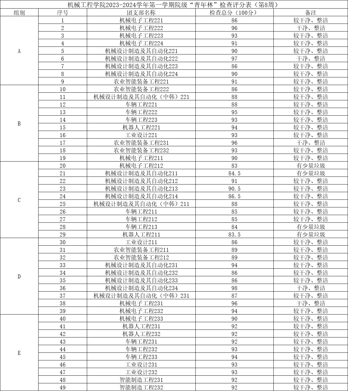 机械工程学院2023-2024学年第一学期院级“青年林”检查评分表(第八周)