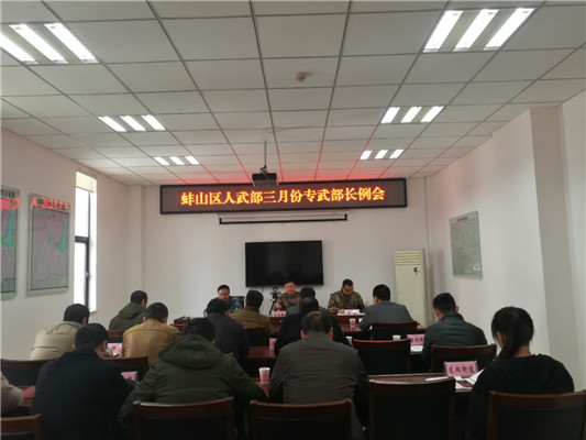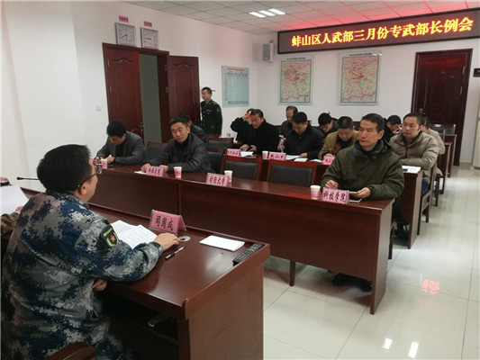 3月21日上午,蚌埠市蚌山区人武部专武部长工作会议在蚌山区人民武装部三楼会议召开。会议由区人武部政委占旭峰主持,我校人武部部长胡明和专武干事参加会议。