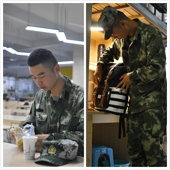 傍晚六点十分,他在三食堂就餐,在众多同色的身影中,他显得如此突出。摆放整齐的帽子,帅气的面庞,一位中国军人的速写已然成型。同时,他还细心地帮有事的室友带了晚餐。