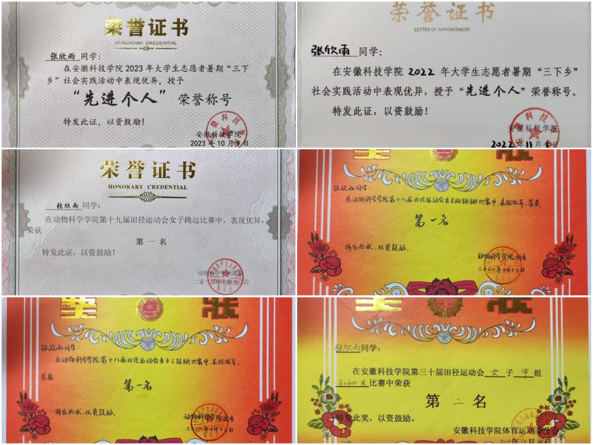 能够不断前进,是一种能力,而懂得适当停下来,是一种智慧。在学习之余,张欣雨还坚持发展体育特长,在校运会上获得女子4*100米第二名、女子三级跳远第二名、女子4*100第三名、女子三级跳远第三名等荣誉。
