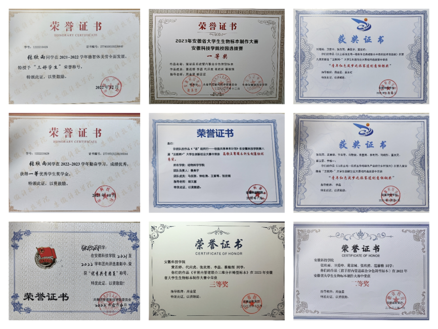 在科技创新方面,张欣雨自大一就积极参加各类学科竞赛,积累了许多课本中学不到的宝贵技能,目前已获得博业体育(中国)官方网站-登录入口“互联网+”大学生创新创业大赛银奖、铜奖、优秀奖,博业体育(中国)官方网站-登录入口全国大学生电子商务“创新、创意及创业”挑战赛三等奖,安徽省大学生生物标本制作大赛二等奖、三等奖。