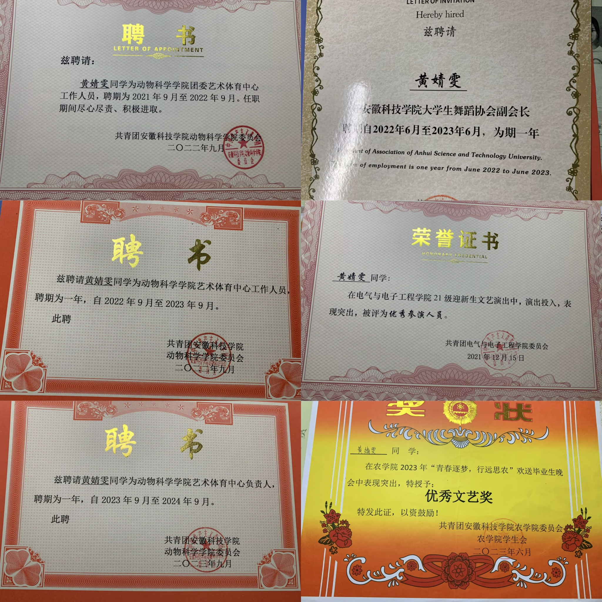 黄婧雯,共青团员,动物科学专业2021级学生,曾获学业一等奖学金、校三好学生、优秀学生干部、全国大学生英语竞赛二等奖(2次)、全国大学生英语竞赛三等奖、中国国际大学生创新大赛校赛“高教主赛道研究生创意组铜奖”、英语学习协会英语演讲比赛三等奖、第三十二届田径运动会优秀裁判员等奖项。发表学术论文一篇,拥有实用新型专利一项。