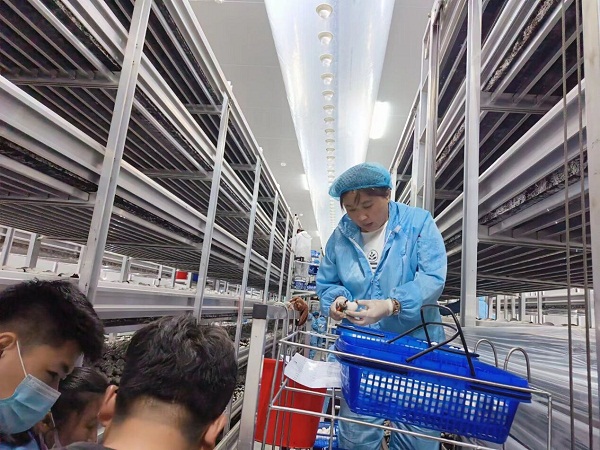 8月7日,团队前往了灵璧县双亚种植专业合作社和中煜生物科技公司,中煜生物科技公司主要产业是现代化的蘑菇种植,负责人带领团队成员参观了化验室,生产办公室,种植区,清洗区,分拣区,包装发货区等。基地内的温度只有15℃左右,工人们都穿着外套进行工作。在这里的工作人员基本上都是附近邱庙村的住户,现公司投入使用的厂区已经可以让邱庙村几百人获得工作。
