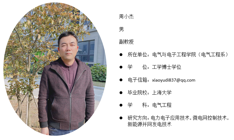 个人简介:2014年毕业于上海大学,获工学博士学位,副教授,中国电源学会高级会员,中国电源学会变频电源与电力传动专业委员会委员,中国电机工程学会会员,IEEE   PELS会员,现任电气与电子工程学院电气工程系主任;主持科研项目2项,发表学术论文15篇,主持教学研究项目2项,获授权发明专利3项。主要承担电气工程及其自动化、建筑电气与智能化专业课程教学任务。