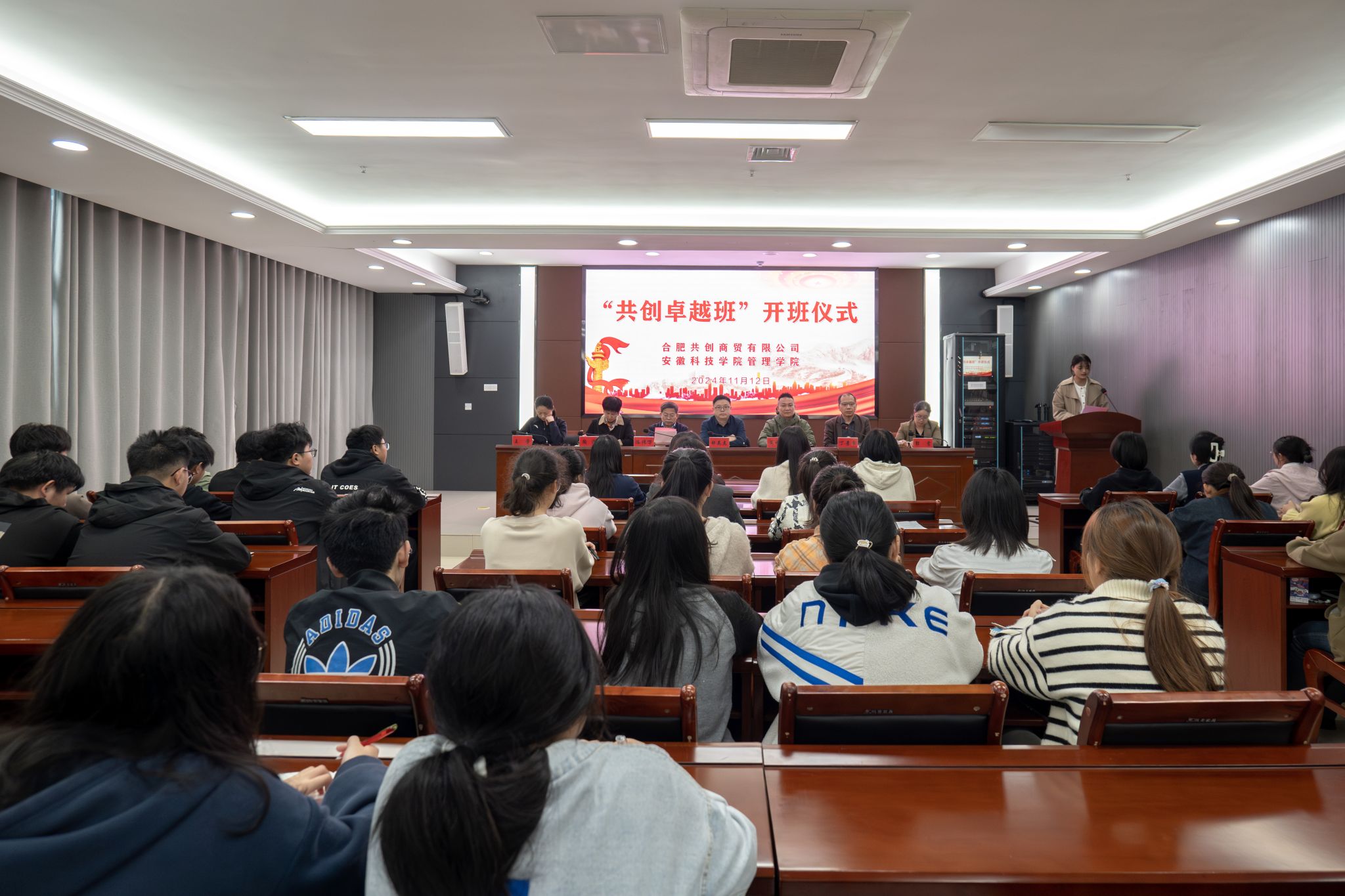 初冬天气暖,小似立春时。11月12日下午,管理学院与合肥共创商贸有限公司(安踏安徽总代理商)联合举办的“共创卓越班”开班仪式在龙湖校区西辅楼111会议室如期举行。学校教务处副处长(主持工作)舒英杰,合肥共创商贸有限公司常务副总经理范中山、合肥共创商贸有限公司人力资源总监郭震、合肥共创商贸有限公司人力资源经理王芳,管理学院党政领导和全体卓越班同学出席了开班仪式。开班仪式由管理学院党委书记丁景良主持。