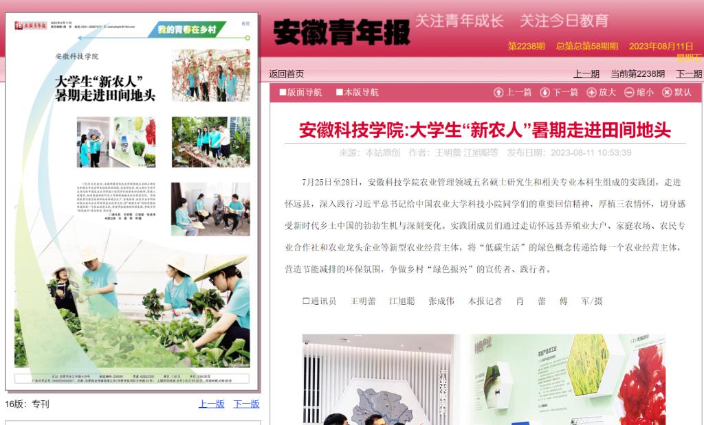 8月11日,《安徽青年报》头版《我的青春在乡村》专栏及第16版《博业体育(中国)官方网站-登录入口:大学生“新农人”暑期走进田间地头》专刊关注报道了学院“力穑兴农”大学生乡村振兴社会实践重点团队在安徽省怀远县开展的社会实践活动。
