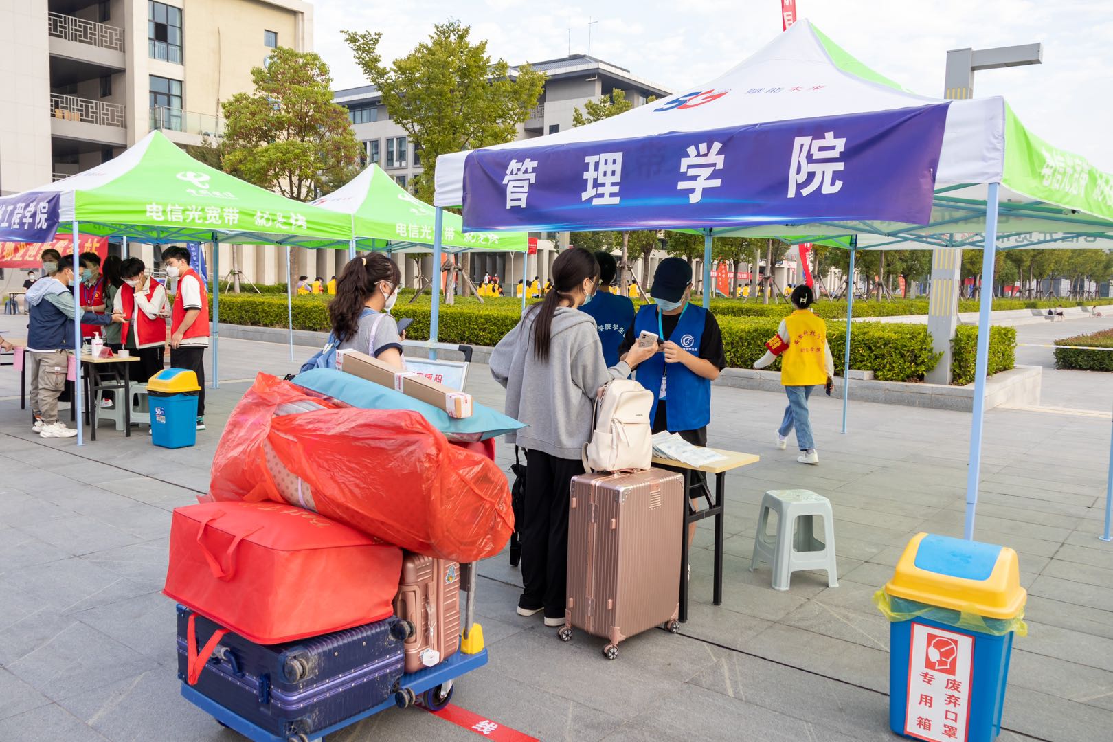 从致知楼连廊下的新生报到信息核验点到学生宿舍,还有着一段不短的距离,学院特别租借了5辆电动三轮车,自报名点到学生宿舍流水作业,轮番为新同学们运送行李。行李上细致地贴着每一位新同学的姓名,避免行李混淆。