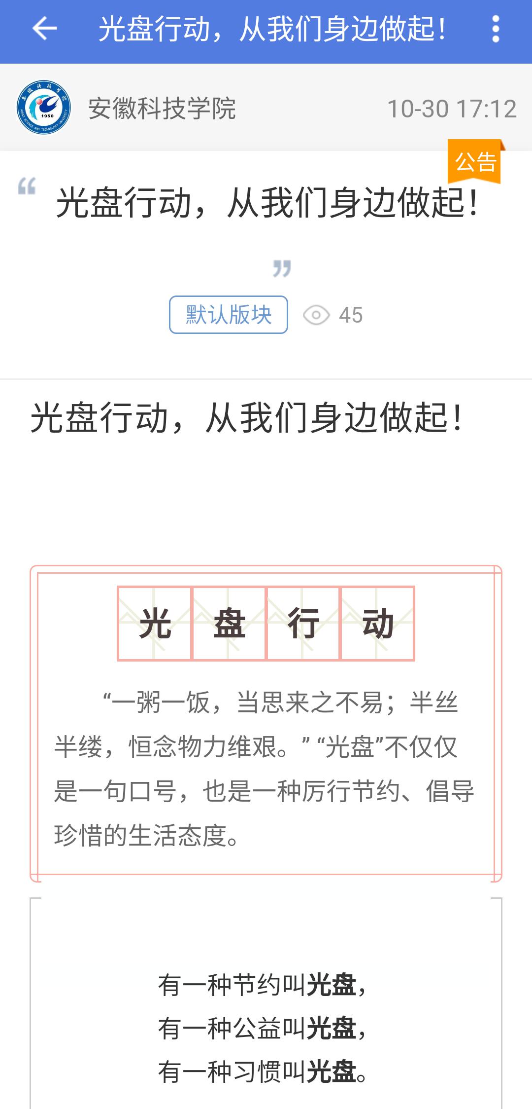 一粥一饭,当思来之不易;半缕半丝,恒念物力维艰。勤俭节约,是中华民族的传统美德,党的十八大以来,厉行节约,反对浪费,在社会上蔚然成风,弘扬勤俭节约的美德,传承“朴实”,“扎实”,“务实”的优秀品格是每个人义不容辞的责任,让我们行动起来,争当勤俭 节约的好标兵!拒绝舌尖上的浪费,光盘一族你我同行。