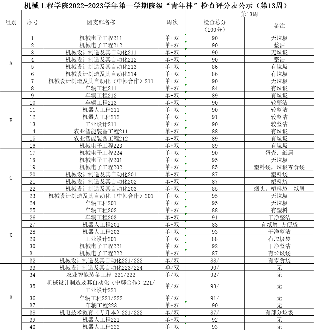 机械工程学院2022-2023学年第一学期院级“青年林”检查评分表公示(第13周)