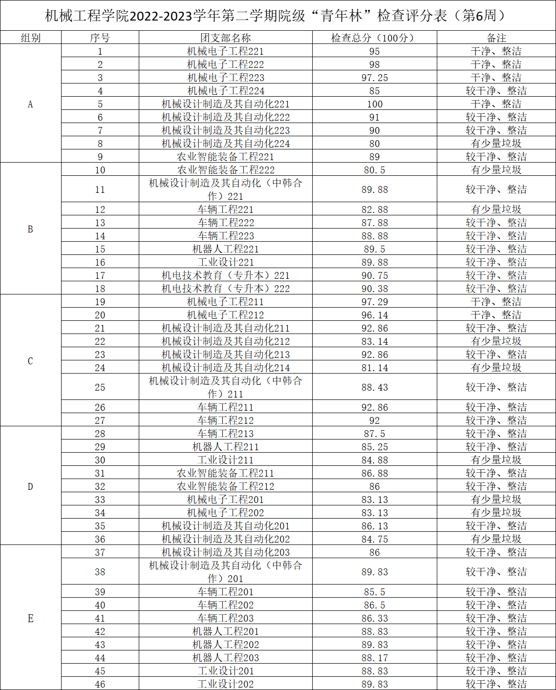 机械工程学院2022-2023学年第二学期院级“青年林”检查评分表公示(第6周)