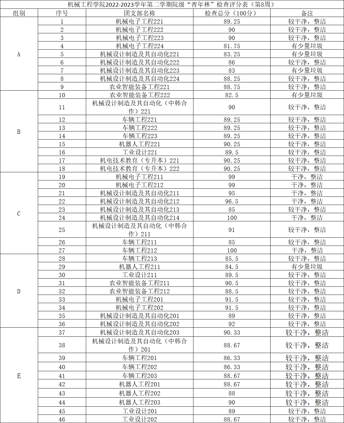 机械工程学院2022-2023学年第二学期院级“青年林”检查评分表公示(第8周)
