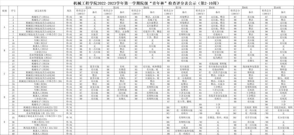 机械工程学院2022-2023学年第一学期院级“青年林”检查评分表公示(第2-10周)