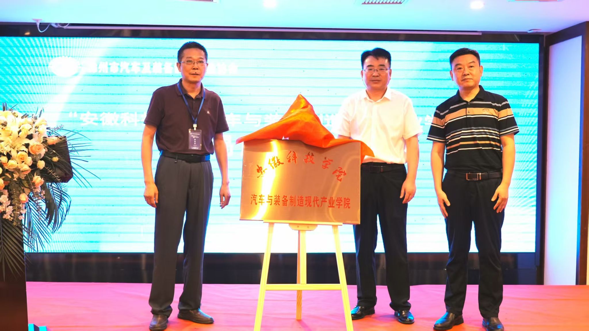 舒英杰、滁州市工信局装备科科长张巍、滁州市汽车及装备制造行业协会秘书长吕志成共同签署“现代产业学院共建协议”。