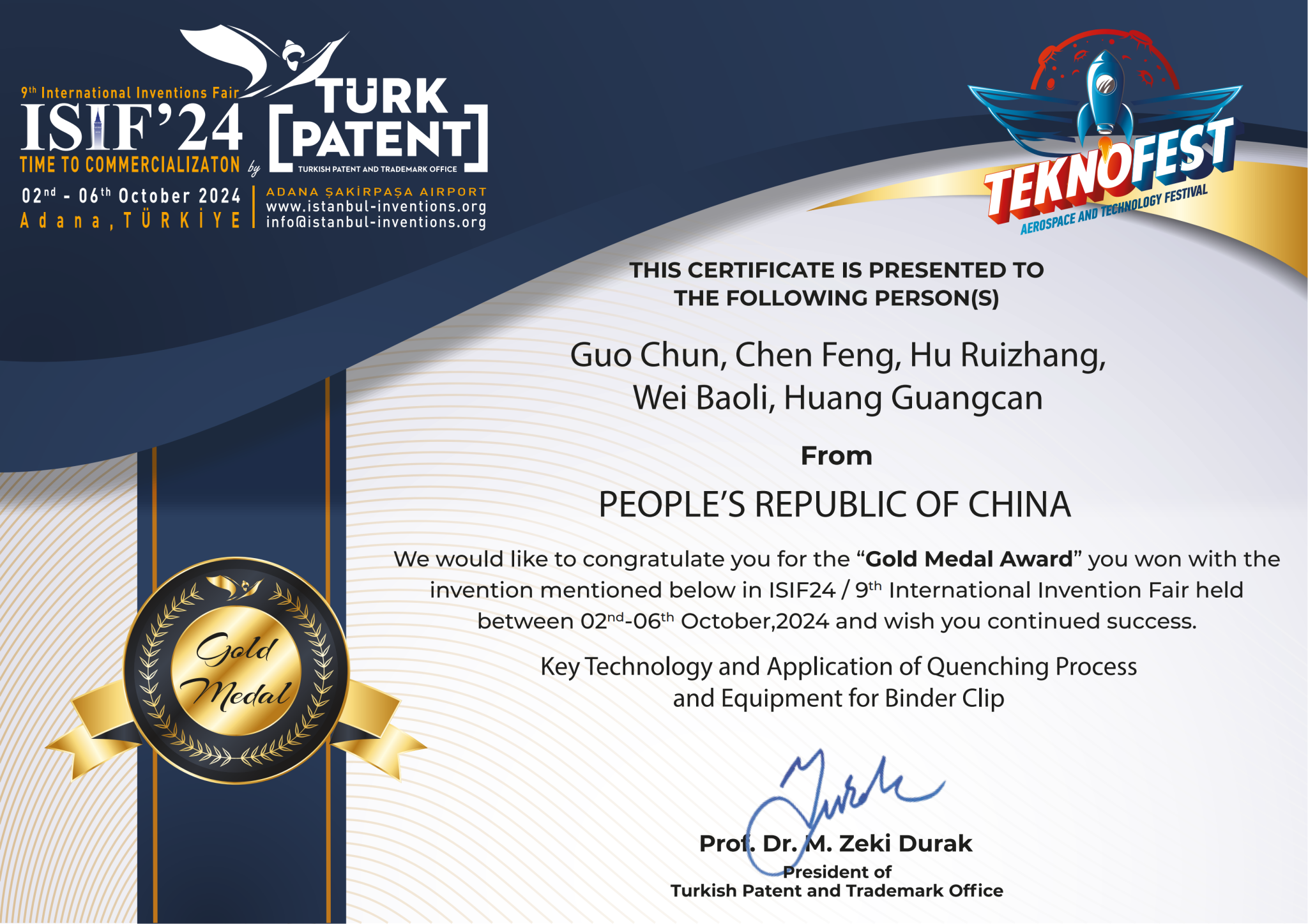 2024年10月02日-10月06日,第九届“伊斯坦布尔国际发明展览会-ISIF’24”在土耳其伊斯坦布尔成功举办。我校机械工程学院材料成型及智能装备科研团队项目《长尾夹淬火工艺与装备关键技术及应用》喜...