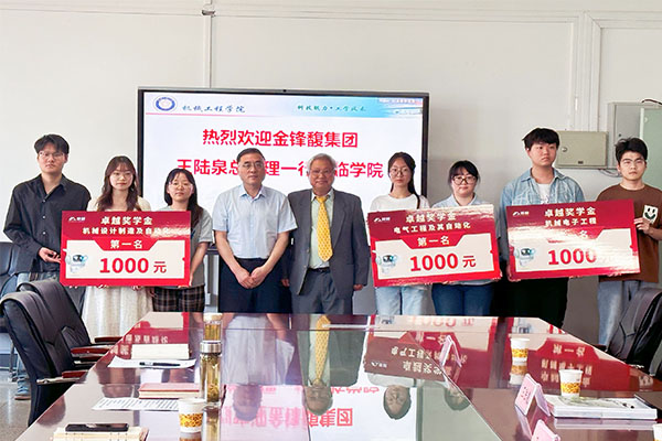 5月16日上午,机械工程学院在笃行楼409会议室举办“金锋馥”奖学金颁奖仪式。金锋馥(滁州)科技股份有限公司总经理王陆泉一行应邀来校为获奖学生颁奖。学院党委书记姚勇,党委副书记、副院长(主...