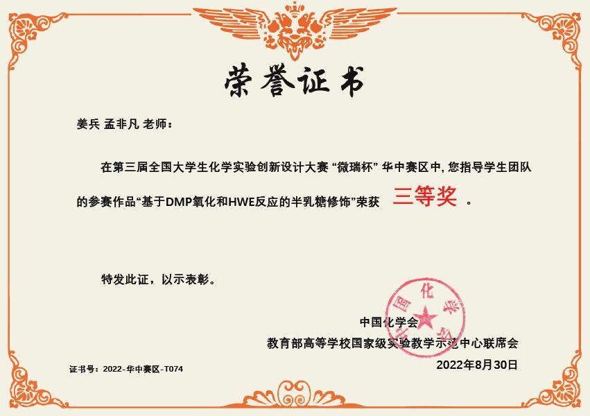 我校化学与材料工程学院姜兵老师、孟非凡老师在实践课程改革和创新实验设计的基础上组建了新创实验代表队(队员:刘兵、杨钰、胡钰,指导教师:姜兵、孟非凡),经过激烈角逐,我校新创实验代表队的作品“基于DMF氧化和HWE反应的半乳糖修饰”获得三等奖。