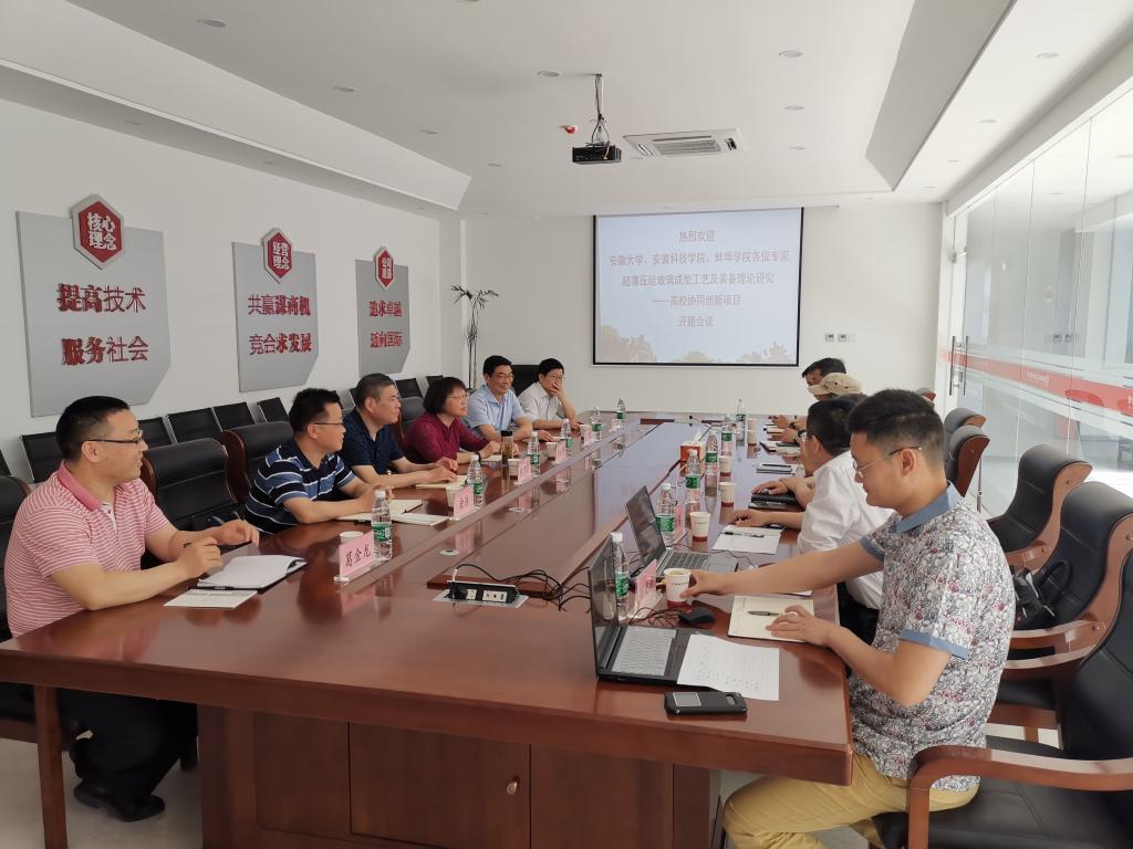 5月23日,由博业体育(中国)官方网站-登录入口化学与材料工程学院牵头承担的安徽省高校协同创新项目“超薄压延玻璃成型工艺及装备理论研究”开题汇报会在蚌埠凯盛工程技术有限公司三楼会议室召开。会议邀请了安徽大学发规处兼科研处处长周虹屏教授、蚌埠凯盛工程技术有限公司总经理叶坤教授级高工、蚌埠凯盛工程技术有限公司总工程师夏鹏华教授级高工、蚌埠学院王传虎教授、博业体育(中国)官方网站-登录入口科研处副处长鲍方印教授、博业体育(中国)官方网站-登录入口财务处副处长王伟高级会计师担任论证专家(含一名财务专家)。周虹屏担任专家组组长并主持会议。化学与材料工程学院党总支书记王明清、院长俞浩教授和超薄压延玻璃成型工艺及装备理论研究项目组骨干成员参加会议。