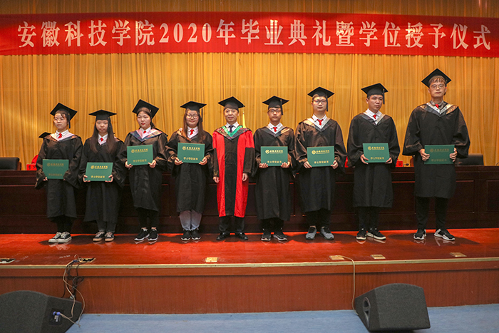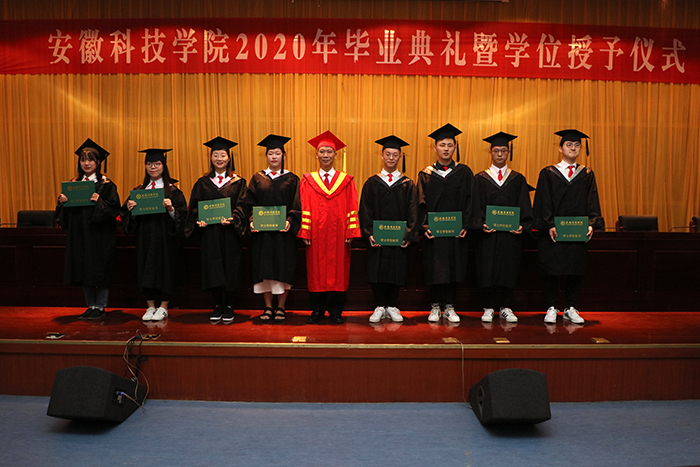 6月22日上午,我校在凤阳校区新图书馆会议中心二楼报告厅举行2020年毕业典礼暨学位授予仪式。党委书记蒋德勤,党委副书记、校长李震,党委副书记韦文联,党委委员、副校长黄远友,党委委员、纪委书记王强,党委委员、副校长黄友锐,党委委员、副校长李升和出席并在主席台就座。蒋德勤、李震为毕业生授予学位,扶正流苏,并合影留念。典礼由黄远友主持。