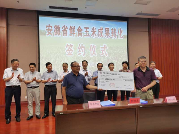交流会期间,参会人员在泗县农科所种植基地进行鲜食玉米新品种观摩品鉴。品种来源主要是我校玉米团队及省内外育种单位选育品种,我校玉米团队带头人余海兵对参加观摩品鉴的新品种进行了介绍。参会领导、相关企业及种植合作社代表对我校选育的融合型甜糯玉米新品种给予高度评价。学校与相关企业代表签订了凤糯211等品种转化合作协议。(特约通讯员:张轶辉 审核:詹秋文 曾献功 卫胜 编辑:汤帅)