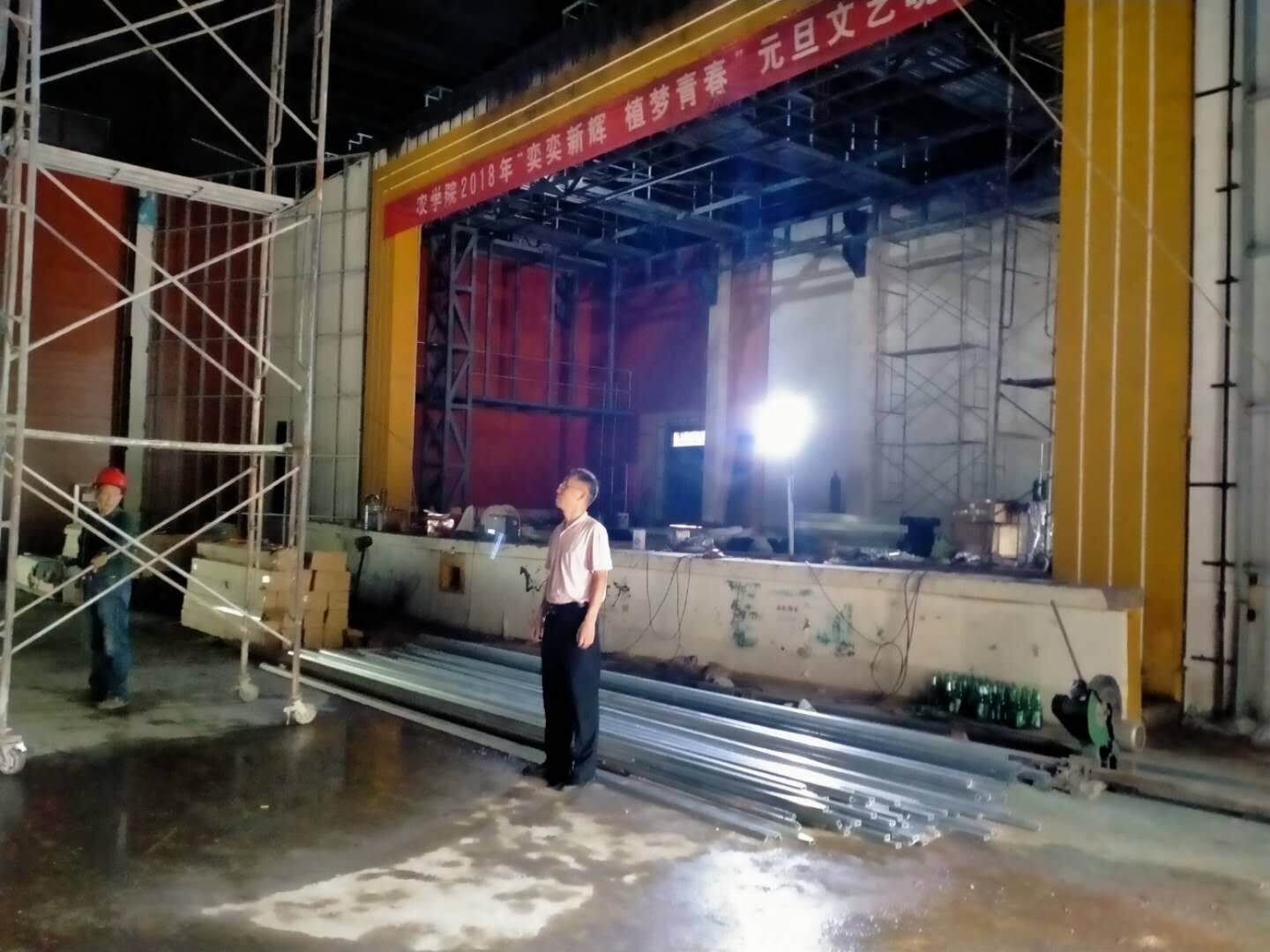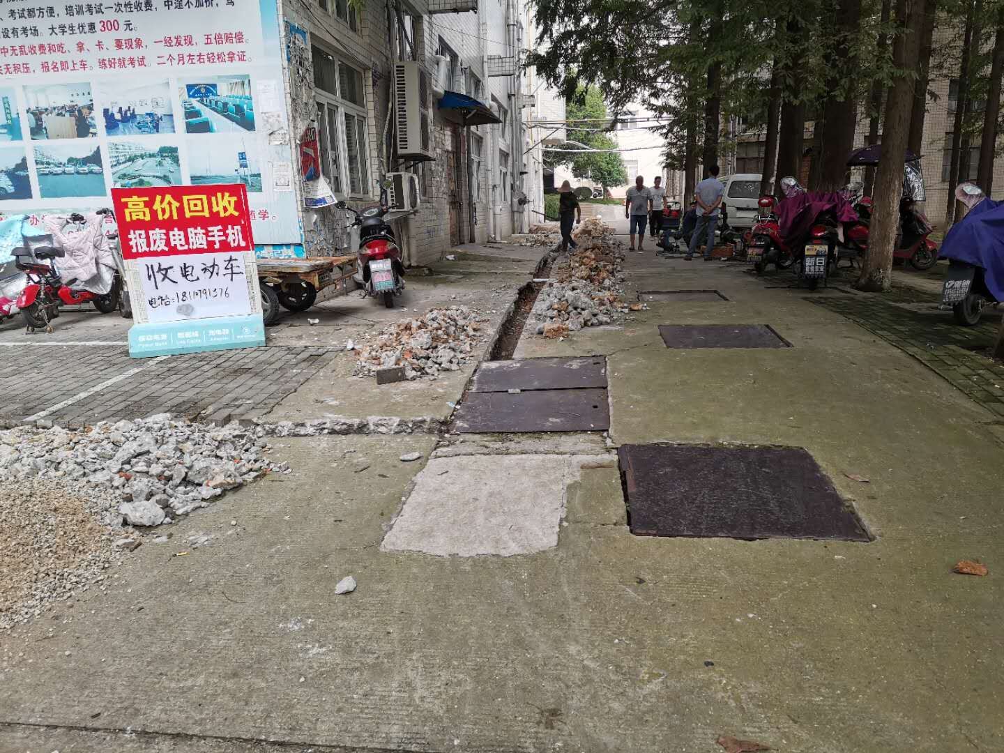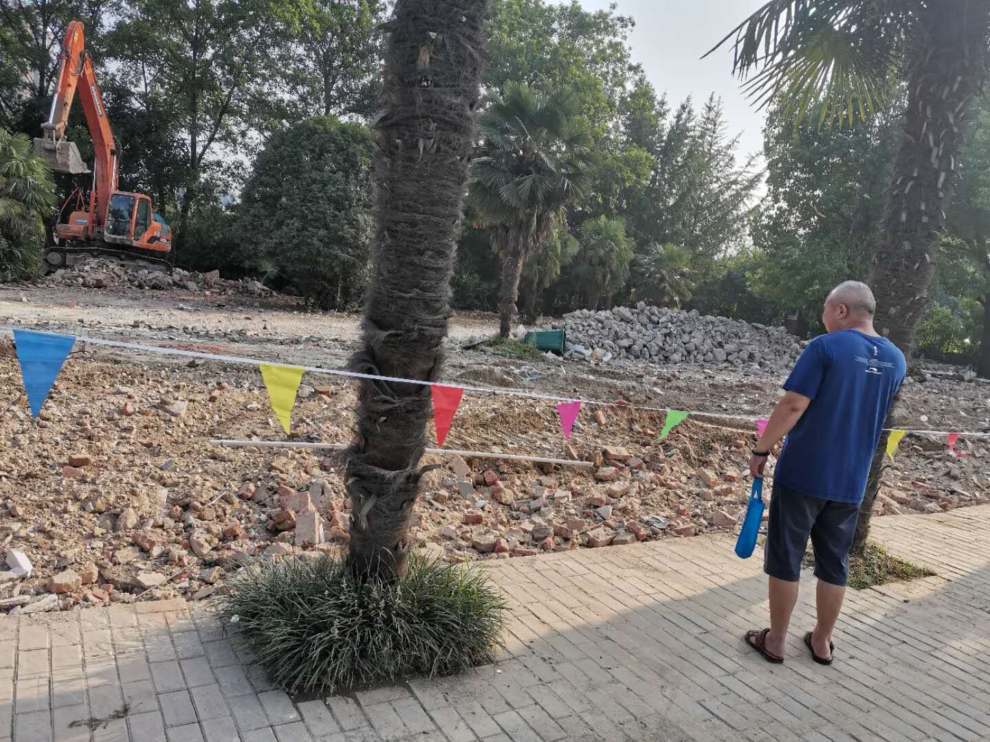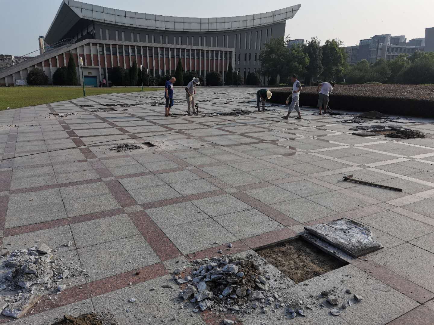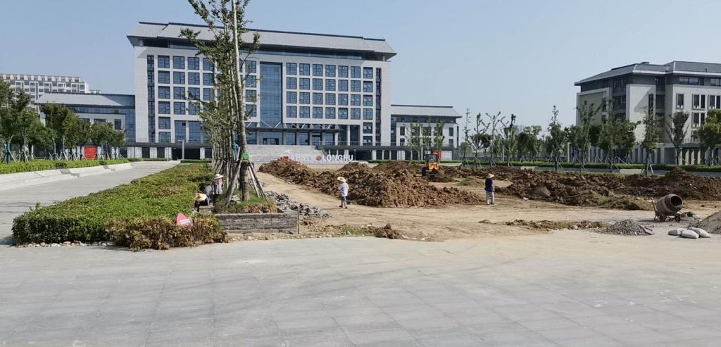 龙湖校区高杆路灯安装和南门沉降池美化工程正在施工