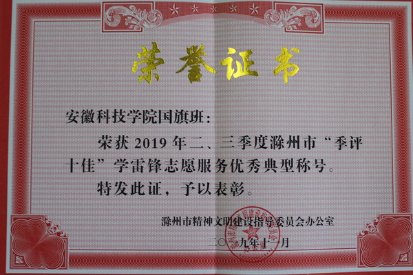 日前,我校国旗班被滁州市精神文明建设指导委员会办公室发文表彰,荣获2019年二、三季度滁州市“季评十佳”学雷锋志愿服务优秀典型称号。