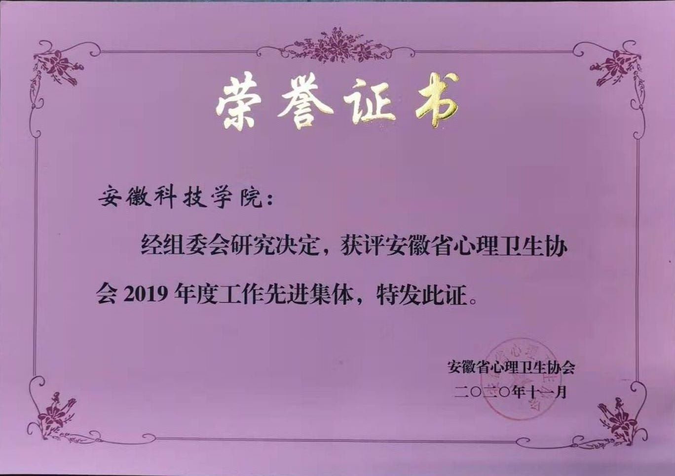 会上成立了安徽省心理卫生协会大学生心理健康教育与咨询专业委员会,选举产生了第一届专委会常务委员会委员及委员,我校胡岚担任第一届专委会常务委员,秦红霞、侯章磊任专委会委员。会议对2019年度在全省心理卫生工作领域作出突出贡献和成绩的先进个人和先进集体进行了表彰,我校获评2019年度工作先进集体荣誉称号。(特约通讯员:石志成 审核:何永勇 编辑:汤帅)