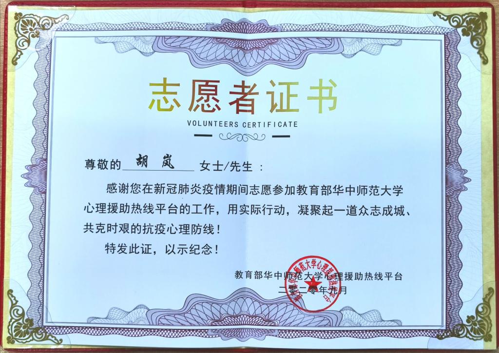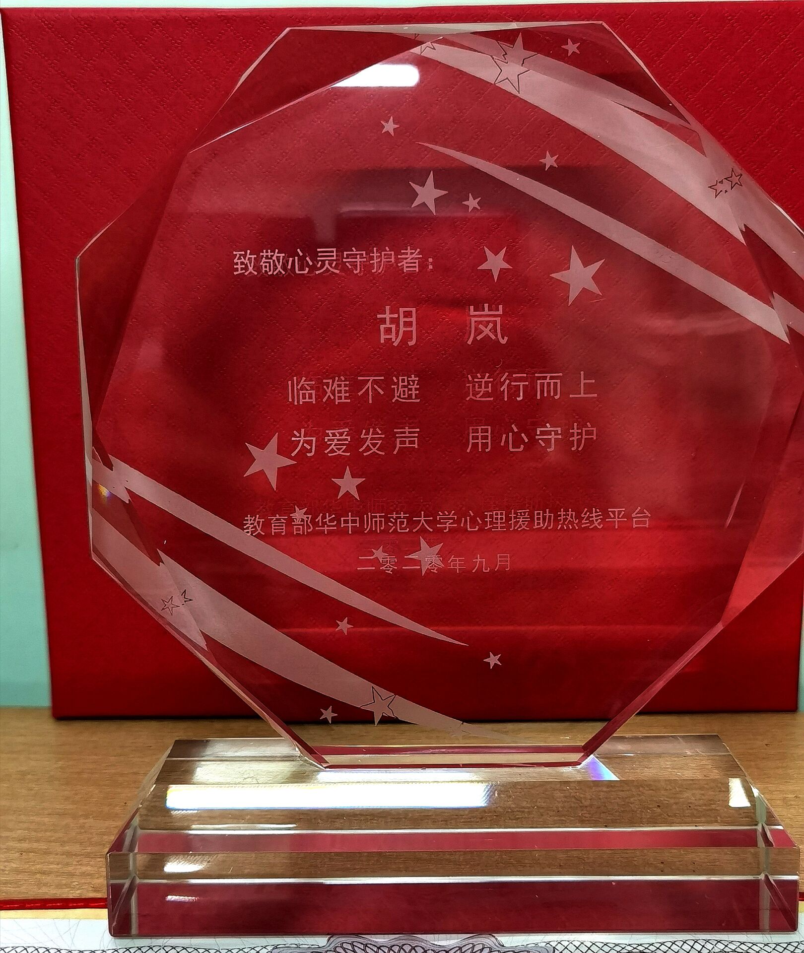 日前,教育部华中师范大学心理援助热线平台发来表彰证书和奖杯,对我校学生处学生心理健康教育与咨询中心专职咨询师胡岚在抗击新冠肺炎疫情期间的志愿服务事迹给予表彰。