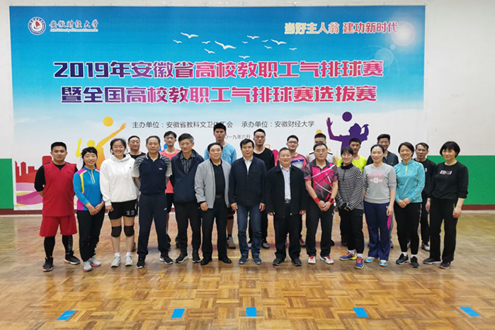 韦文联、程刚兴致勃勃地观看了我校与安徽财经大学职工气排球队交流比赛,并与参赛队员合影留念。(特约通讯员:张以保 审核:汪洋 编辑:张威)