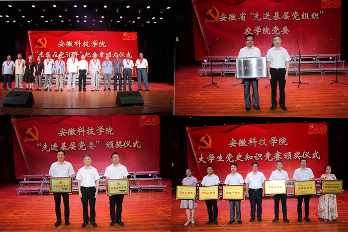 比赛现场,作为获奖单位代表刚刚参加中共安徽省委全省“两优一先”表彰大会的农学院党委书记何世潮向参赛教职工展示了全省“先进基层党组织”奖牌并发表获奖感言。在今年省委教育工委“两优一先”评选表彰中,我校詹秋文教授荣获“安徽省高校优秀共产党员”荣誉称号,许欣、耿广汉荣获“安徽省高校优秀党务工作者”荣誉称号,资源与环境学院环境科学与工程系教工党支部、人文学院中文系教工党支部荣获“安徽省高校先进基层党组织”荣誉称号。活动现场举行了我校“两优一先”表彰仪式,蒋德勤、李震、黄远友、王强、李升和等在校校领导为获奖单位和个人代表颁奖。通过表彰先进典型,激励、引导全校广大党员干部牢记初心使命、传承红色基因、永葆奋斗本色,团结一心、奋力拼搏,更好发挥基层党组织的战斗堡垒作用和党员的先锋模范作用,为描绘好新时代安科事业发展新画卷而努力奋斗。