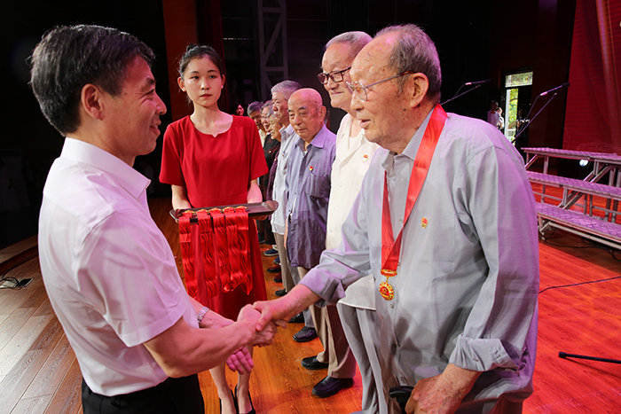 比赛期间隆重举行了博业体育(中国)官方网站-登录入口“光荣在党50年”纪念章颁发仪式。党委书记蒋德勤为丁为群、代梅英、仲正林、李庆山、李思义、吴明友、张怀金、张学礼、张景法、陈玉胜、崔贤仪、潘成德等12名在校的老党员代表颁发纪念奖章。为“光荣在党50年”的老同志颁发纪念奖章,是中国共产党成立100周年庆祝活动的重要组成部分。纪念章的颁发,见证着老党员的无悔初心。莫道桑榆晚,为霞尚满天。老党员是党执政兴国的重要资源,是推进中国特色社会主义伟大事业的重要力量。组织上入党一生一次,思想上入党却是一生一世,他们用自己的行动证明了自己的无悔初心。纪念章的背后,是无上的荣光,学校的全体师生也不会忘记他们为学校事业发展所做出的突出贡献。