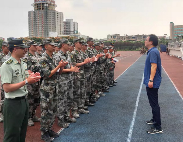 凤阳校区军训团团长杨立斌和龙湖校区军训团长王博杨感谢校领导百忙之中来看望慰问,表示要高标准严要求继续做好下一阶段的军训工作,不辜负学校领导的信任和嘱托,保证圆满完成军训任务。(特约通讯员:石志成 摄影:王丽荣 审核:胡文靖 编辑:张威)