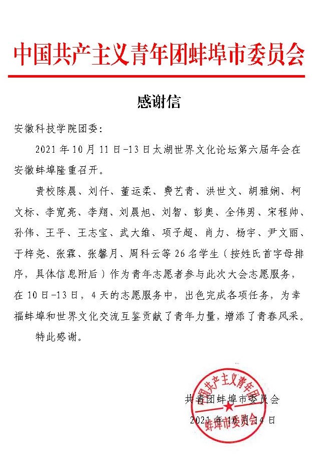 10月11日-13日,太湖世界文化论坛第六届年会在蚌埠古民居博览园隆重召开,我校26名青年学子作为志愿者参与大会志愿服务工作。在为期4天的志愿服中,志愿者分布在嘉宾签到注册、会场指引、会务协助、秩序维护、物料管理、防疫协助等岗位,出色的完成了各项任务,为幸福蚌埠和世界文化交流互鉴贡献了青年力量,受到外界一致好评。蚌埠团市委向我校团委致感谢信。