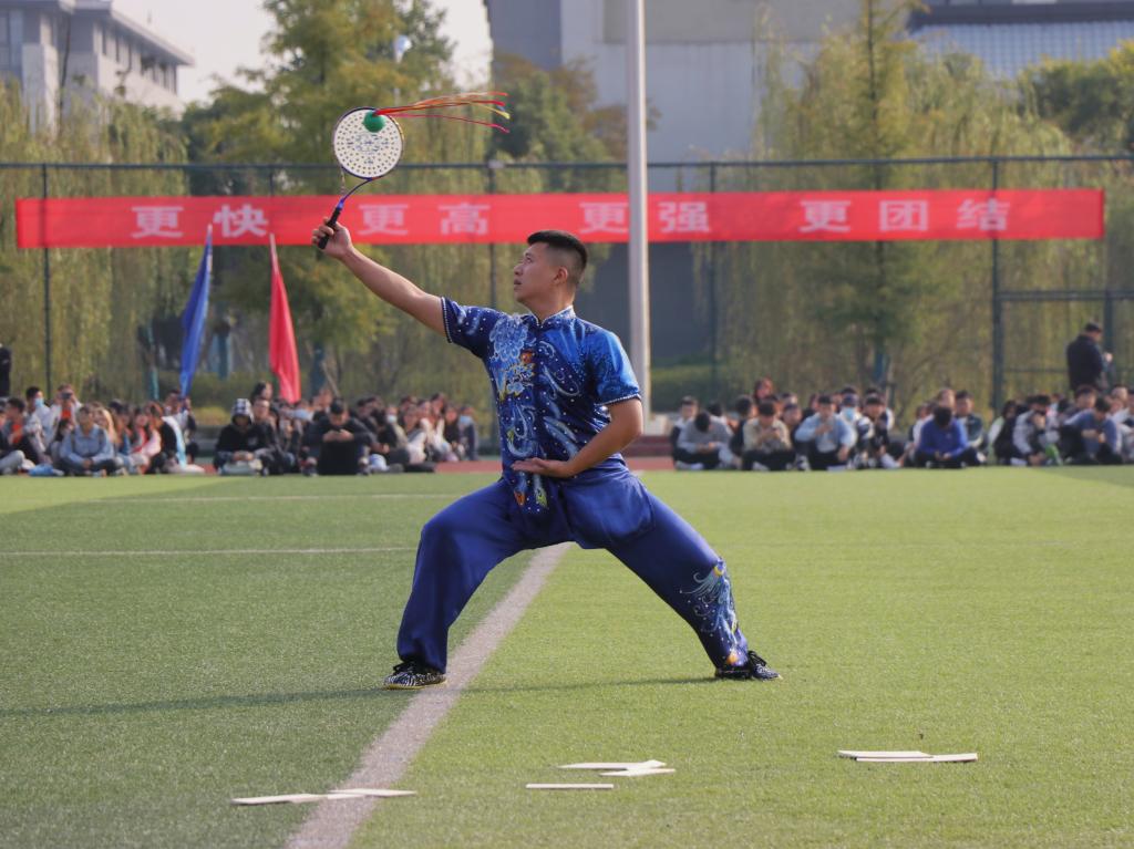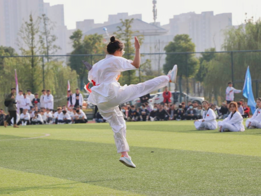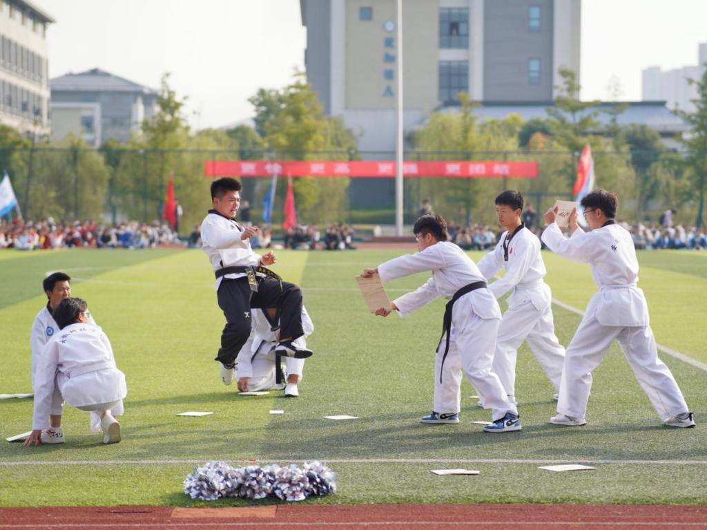 振奋有力的跆拳道、引人入胜的武术表演一出场便引起了同学们的阵阵惊叹。破碎的木屑在空中飞舞,晶莹的汗水挂在表演者的眉梢,举手投足间洋溢着青春的亮丽,书写着如火的青春。“昔有佳人公孙氏,一舞剑气动四方”;今有安科运动儿,一舞剑气惊天地。舞剑健儿的动作行云流水,一气呵成,气势磅礴。激扬雄厚的声音,整齐划一的动作,打拳运动员静若处子,动若脱兔,双臂有如分水之势,虎虎生威。