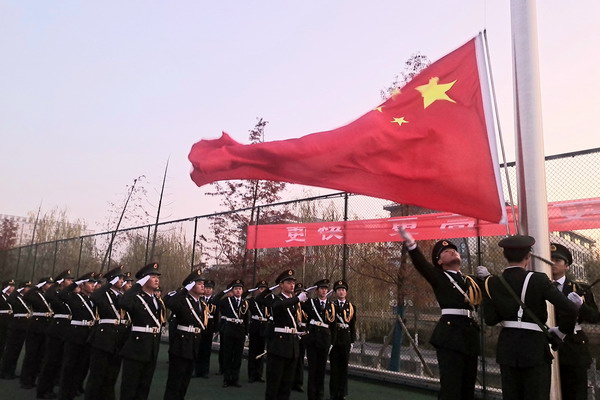6时40分,升旗仪式正式开始。国旗护卫队的队员们气宇轩昂,迈着整齐的步伐,喊着嘹亮的口号护送国旗,伴随着《义勇军进行曲》国旗徐徐升旗,同学们面向国旗行注目礼,表达着对祖国无限的热爱和崇高的敬意。升旗仪式结束后,第26届国旗护卫队队员李凯声情并茂地朗诵了“四史”经典《我骄傲,我属于中国》:“我坚信,如今我身上的每丝热量,都是祖先钻木取火时,留下的宝贵遗产,我的每一个想象,都连着结绳记事的那根绳索,我是坎坷,但在艰难中找到了尊严……我骄傲,我的信仰,我的爱情,我的一切一切,都属于我的母亲——中国”。朗诵完毕,在场的全体师生都发出了深深的感慨,脑海中不停地环绕着新中国成立的喜悦与不忘初心砥砺前行的不屈精神。