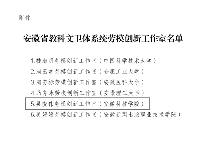 12月27日,安徽省教科文卫体工会下发《关于命名安徽省教科文卫体系统劳模创新工作室的决定》文件,我校食品工程学院吴晓伟副教授领衔申报的“劳模创新工作室”荣获命名。