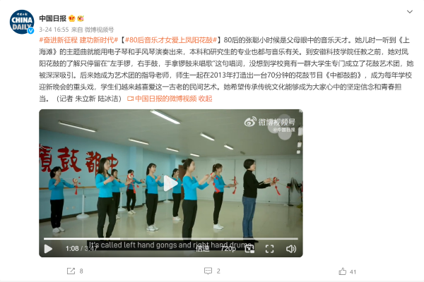 《中国日报》报道我校教师创新传承凤阳花鼓事迹