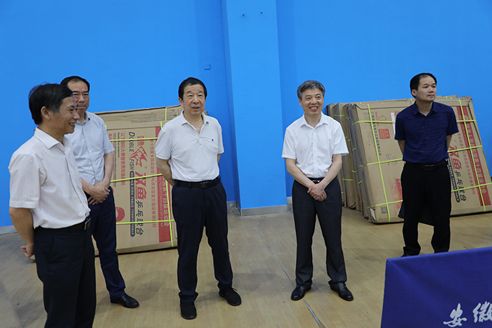 6月22日下午,省教育厅副厅长储常连一行来校调研指导省运会高校部乒乓球比赛筹备工作,党委书记蒋德勤,党委副书记、院长李震,党委委员、副院长李升和及体育教学部负责人陪同调研。