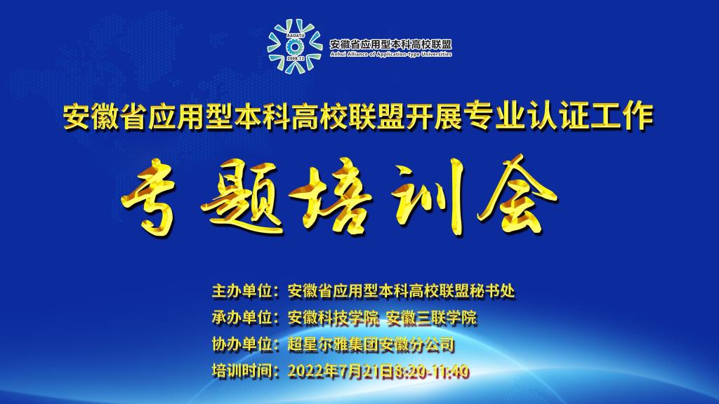 7月21日上午,由安徽省应用型本科高校联盟主办,博业体育(中国)官方网站-登录入口、安徽三联学院承办,超星尔雅集团安徽分公司协办的安徽省应用型本科高校联盟专业认证专题培训会在我校成功举行。本次会议采用直播形式进行线上培训,来自安徽省应用型本科联盟24所高校负责专业认证工作的职能部门负责人,相关专业负责人、骨干教师和相关工作人员近600人参会。会议由教务处处长赵伟峰主持。