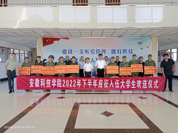 9月16日上午,我校2022届应征入伍毕业生欢送仪式在蚌埠某基地举行。校党委书记蒋德勤,党委委员、纪委书记、监察专员王强出席仪式并为应征入伍毕业生颁发入伍奖励金和赠送纪念品。校学生处、保卫处和相关学院负责同志参加活动。