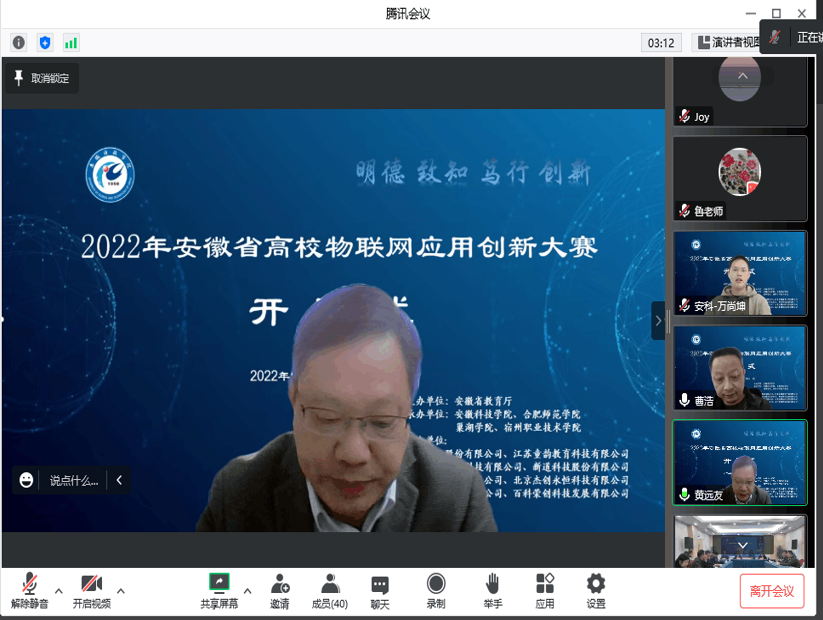 11月13日上午,由安徽省教育厅主办,博业体育(中国)官方网站-登录入口信息与网络工程学院承办的2022年安徽省高校物联网应用创新大赛在我校龙湖校区如期举行,我校党委委员、副院长黄远友出席开幕式并致开幕辞。安徽省电子学会理事长吴先良、安徽省计算机学会名誉理事长顾乃杰、安徽省电子学会秘书长陈蕴、安徽省教育厅大创办于嘉怡、大赛专家评委、以及部分参赛师生参加了开幕式,开幕式由信息与网络工程学院院长余宏杰主持。
