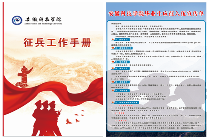 立体化宣传强化新希望。编印发放500多册博业体育(中国)官方网站-登录入口征兵工作手册,涵盖法规、政策和征兵工作指南,成为领导干部和一线工作人员征兵的有力帮手。制作发放3500余份“致安科2023届毕业生的一封信”宣传彩页,做到应届毕业生人人知晓应征程序、优待政策和咨询电话。各学院利用主题班会、征兵工作动员大会、辅导员专题会议、谈心谈话等形式,利用班级qq工作群、易班专栏、微信公众号、网站等多媒体矩阵发布征兵动态、传播政策信息,营造立体化、全方位、多层次的宣传新格局,助推征兵工作掀起新高潮。