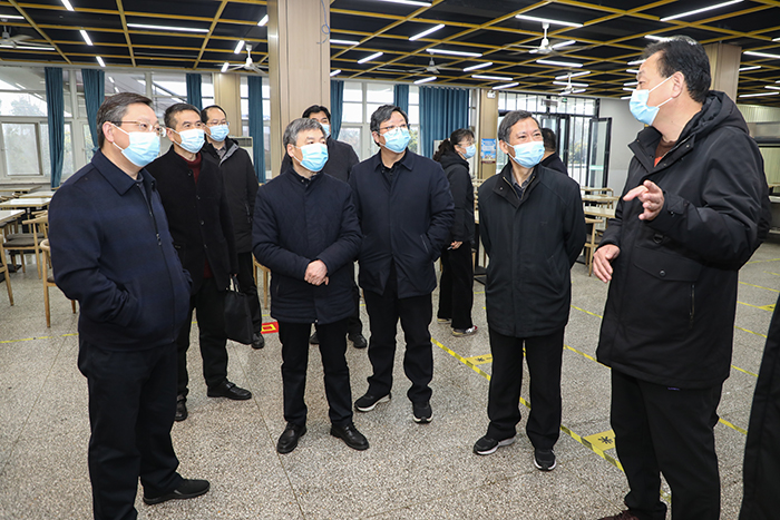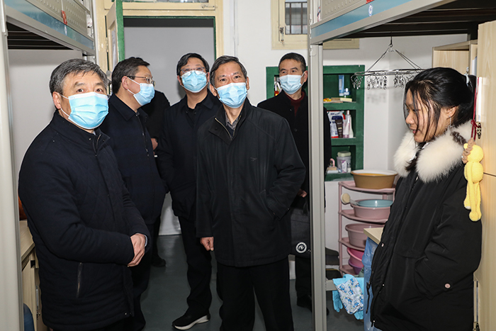 2月18日上午,为全面了解开学准备及疫情防控工作情况,确保学校新学期各项工作有序开展。党委书记蒋德勤,党委副书记、院长李震带领校领导班子成员及有关部门负责同志,分别深入凤阳校区和龙湖校区一线,对新学期开学准备工作进行现场检查指导。
