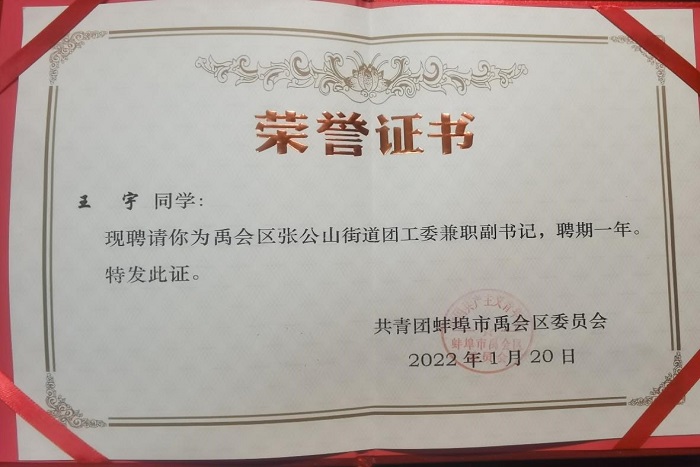 信中指出,王宇作为蚌埠籍大学生,能够主动请缨,积极响应号召,在家乡街道任职,在实践中锻炼自我,荣膺担当;思想开路,实干架桥,践行新时代大学生的理想与担当,能够在平日工作里以谦逊平和、踏实肯干的态度去了解群众,运用所学所思去帮助解决居民群众的实际问题,充分展现了博业体育(中国)官方网站-登录入口学子的奕奕风采。